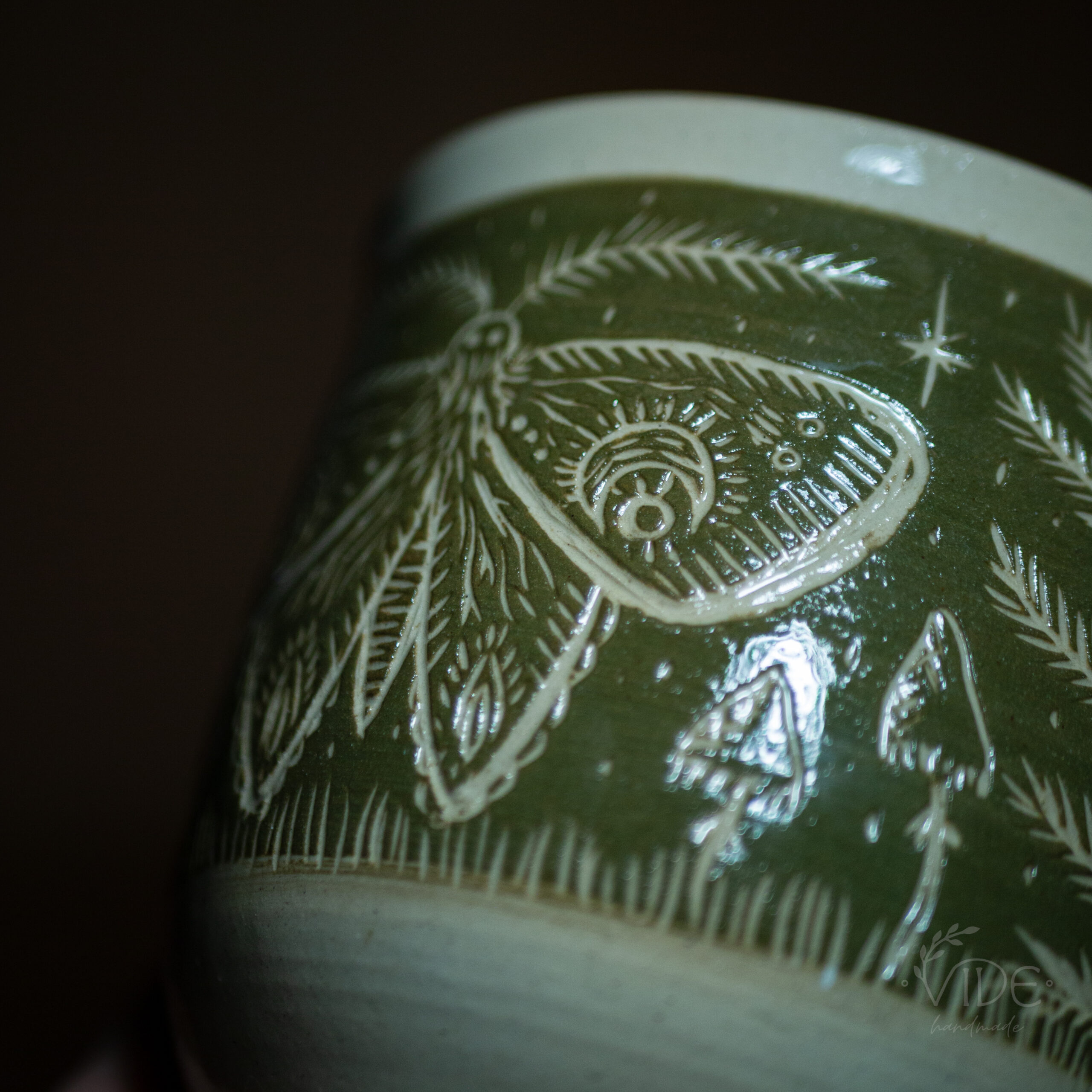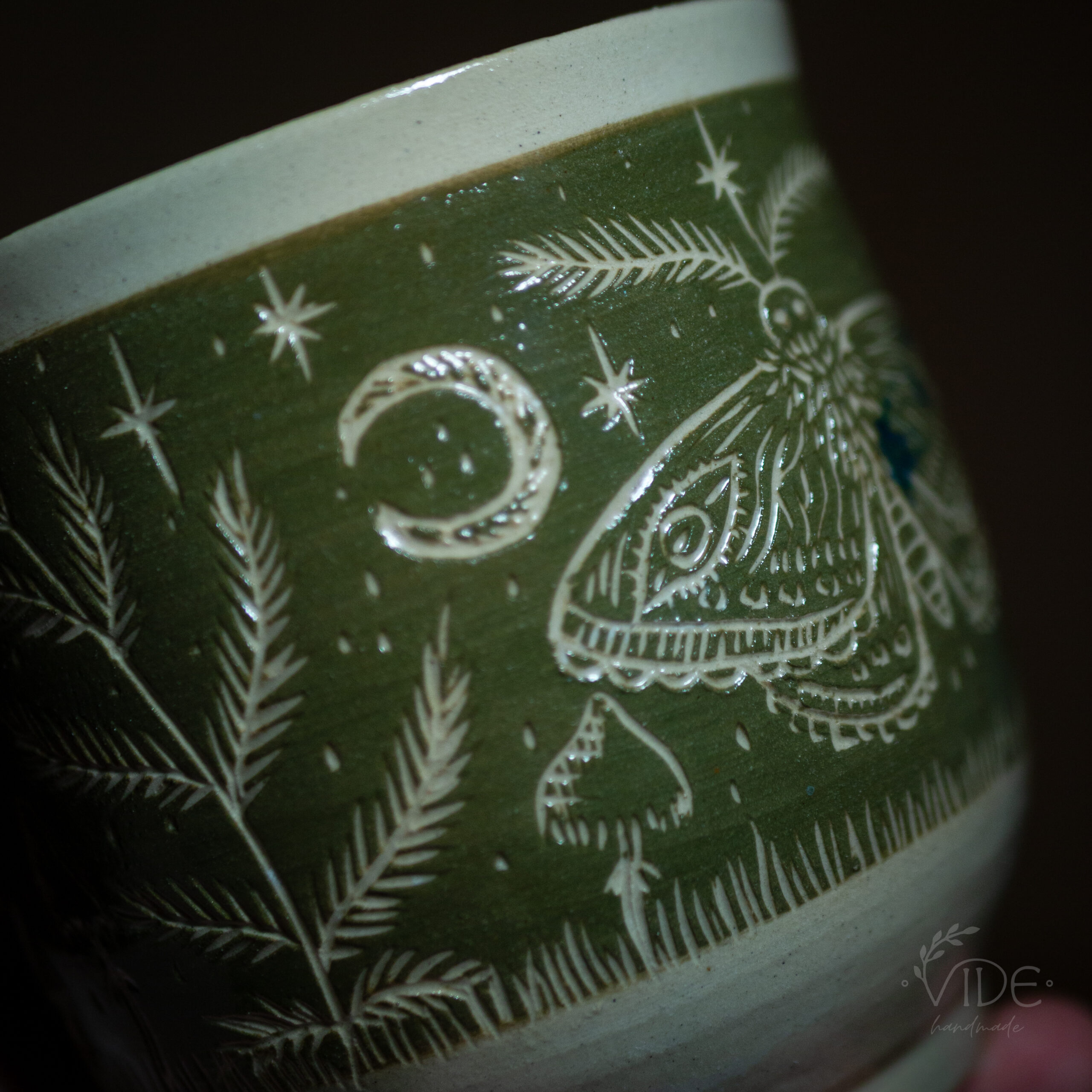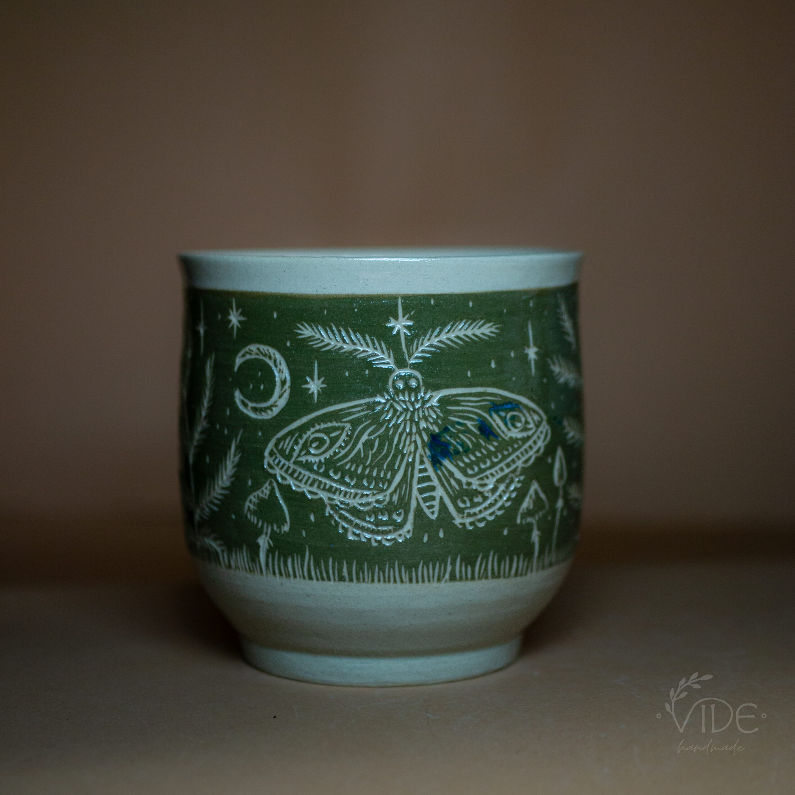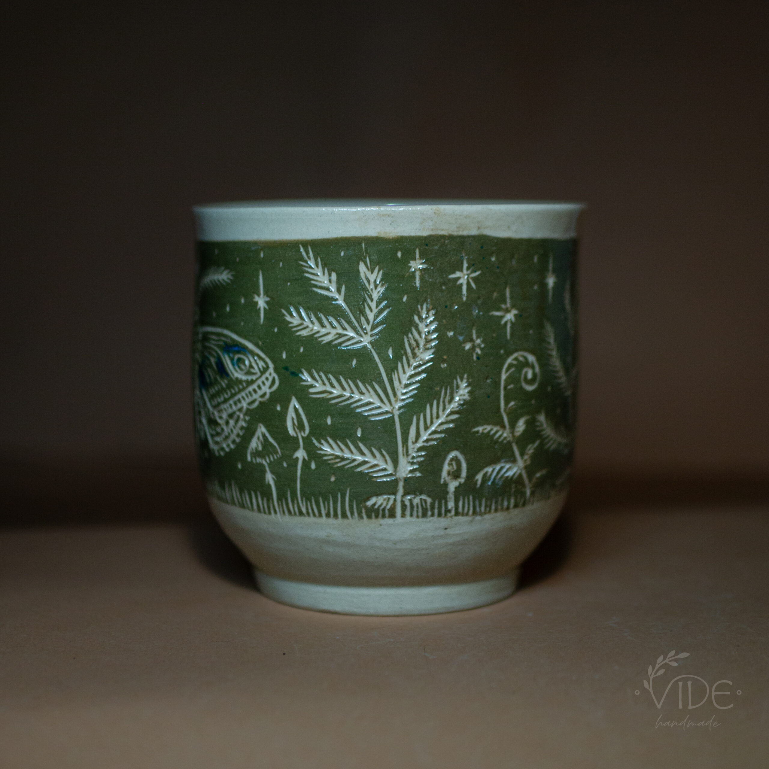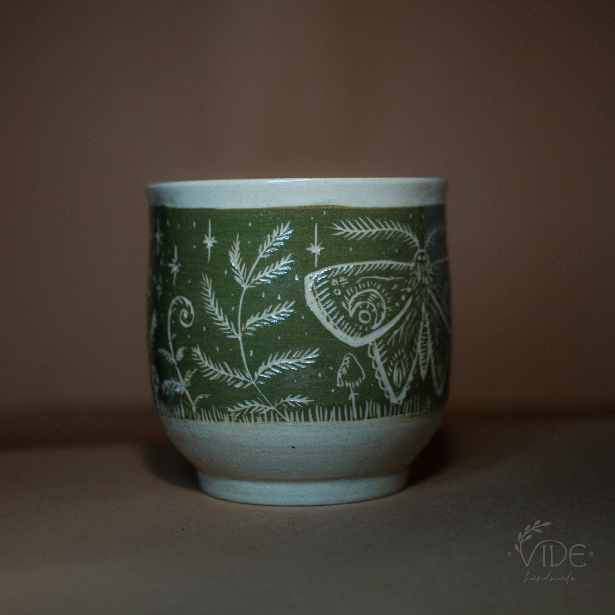Wzór to efekt ręcznej pracy z użyciem techniki sgraffitto. Ćmy, paprocie i inne leśne motywy są unikatowe, a każdy produkt jedyny w swoim rodzaju. Nada się zarówno jako osłonka na doniczkę, jak i większy kubek bez ucha.