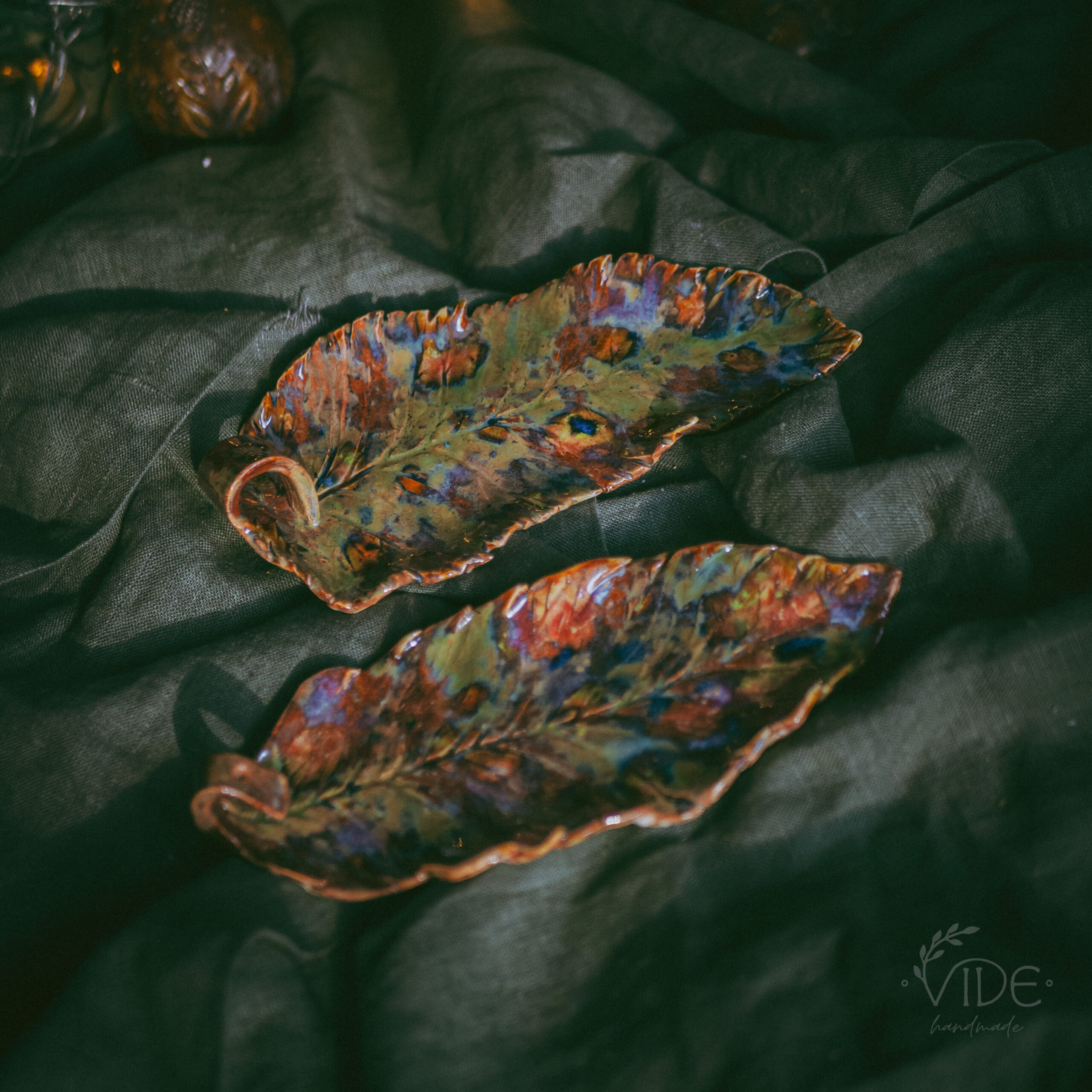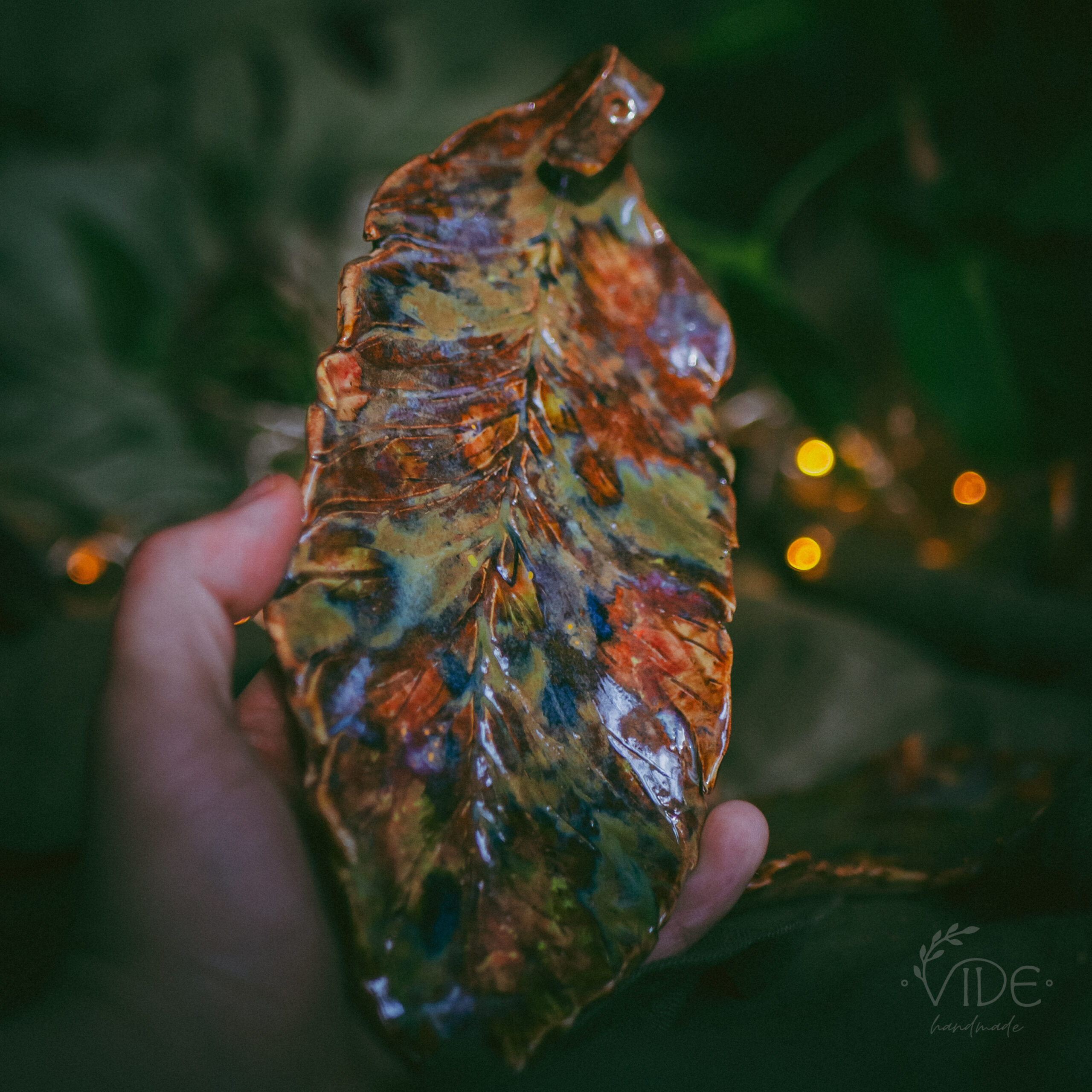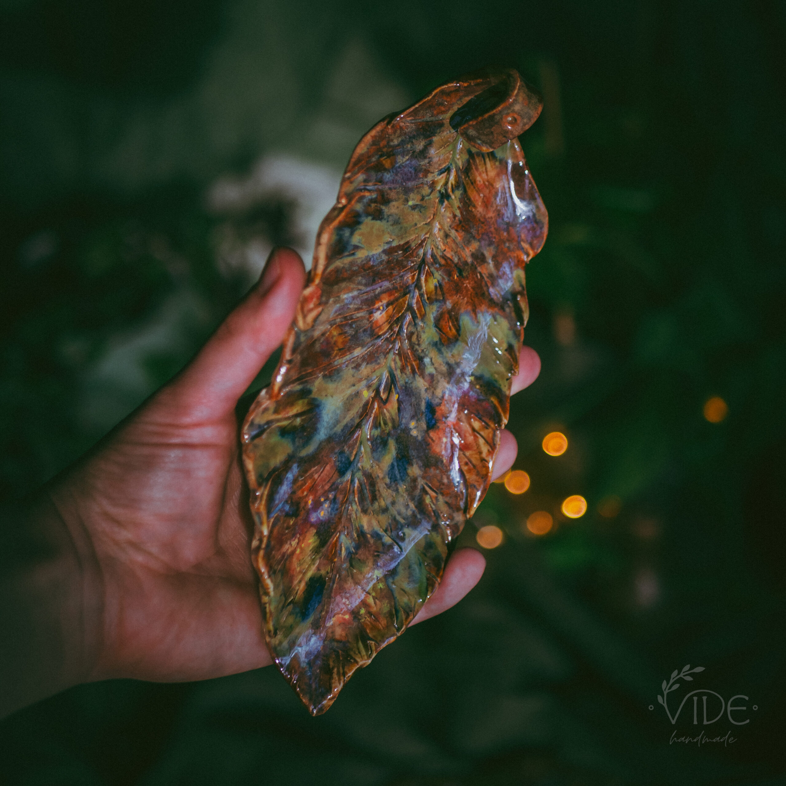 Podstawka na biżuterię, klucze, lub kadzidełka w kształcie liścia z mieszanką efektowych szkliw tworzących razem niepowtarzalny efekt.