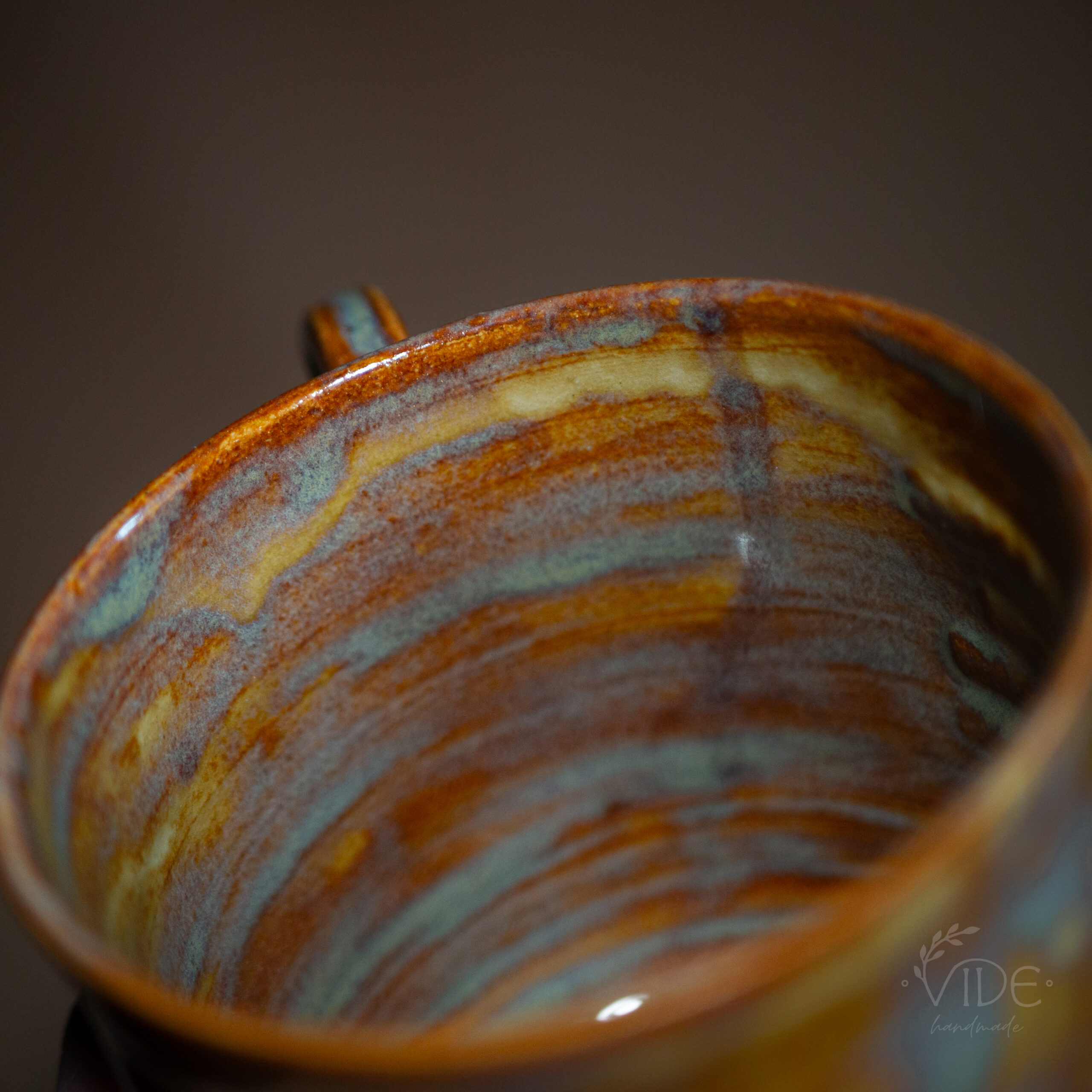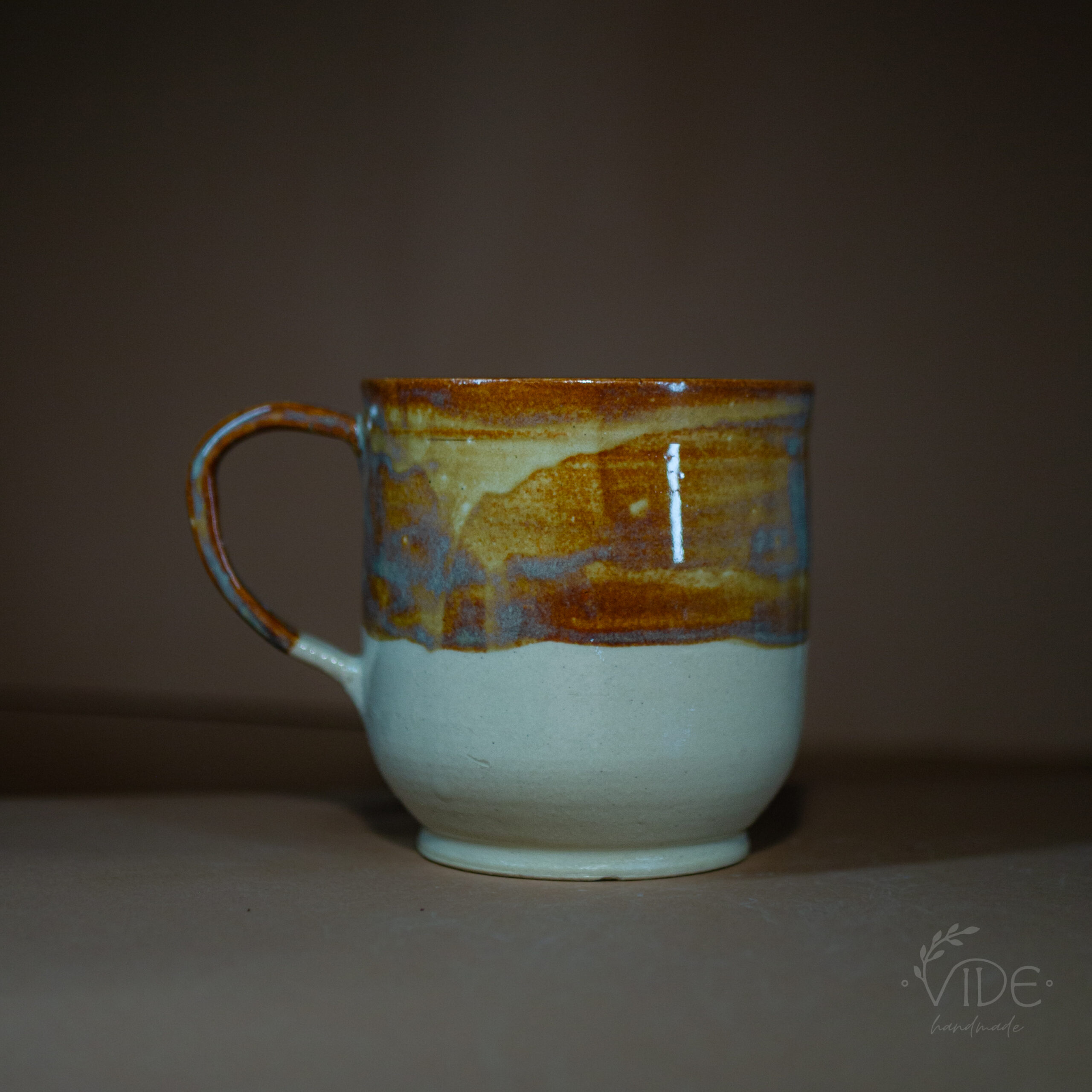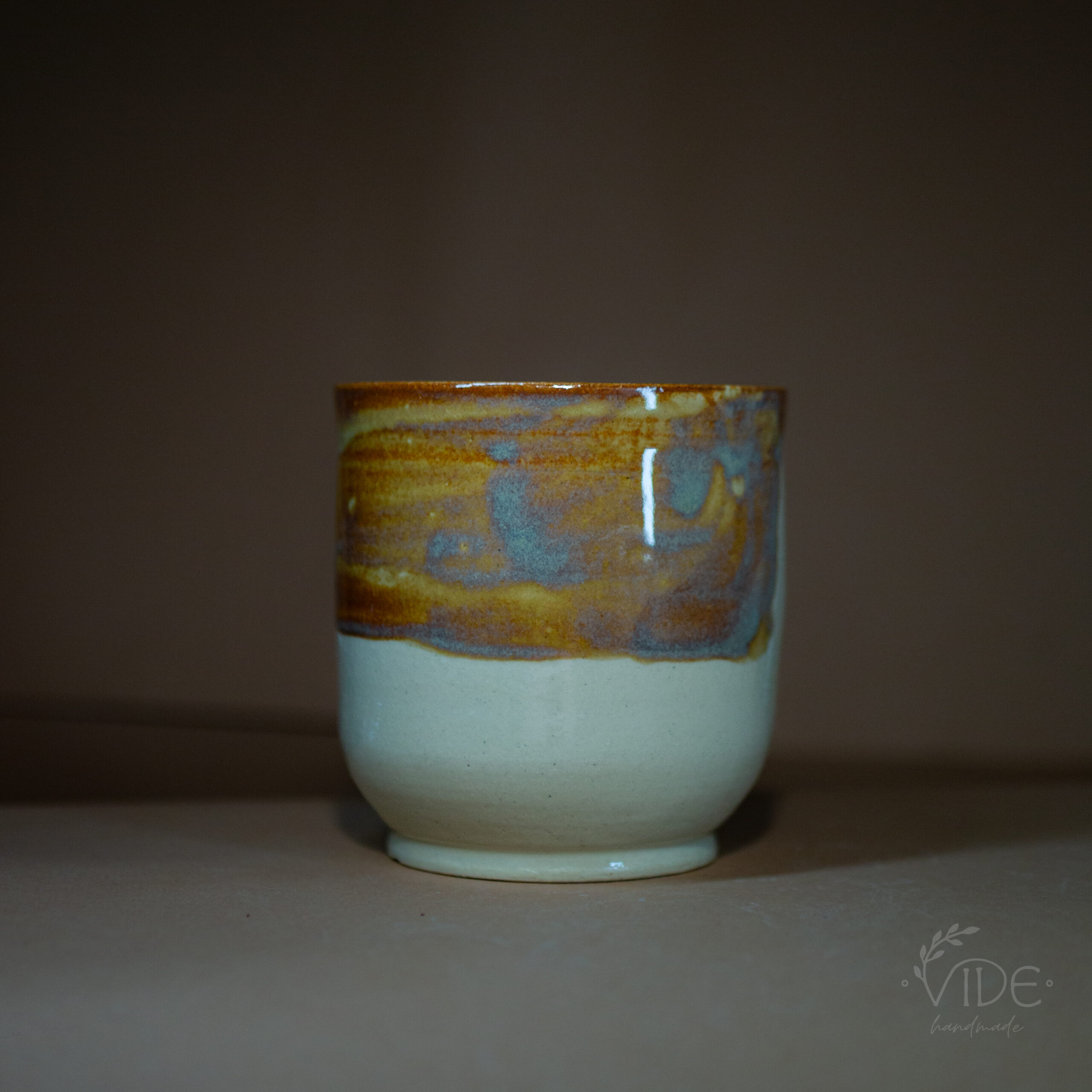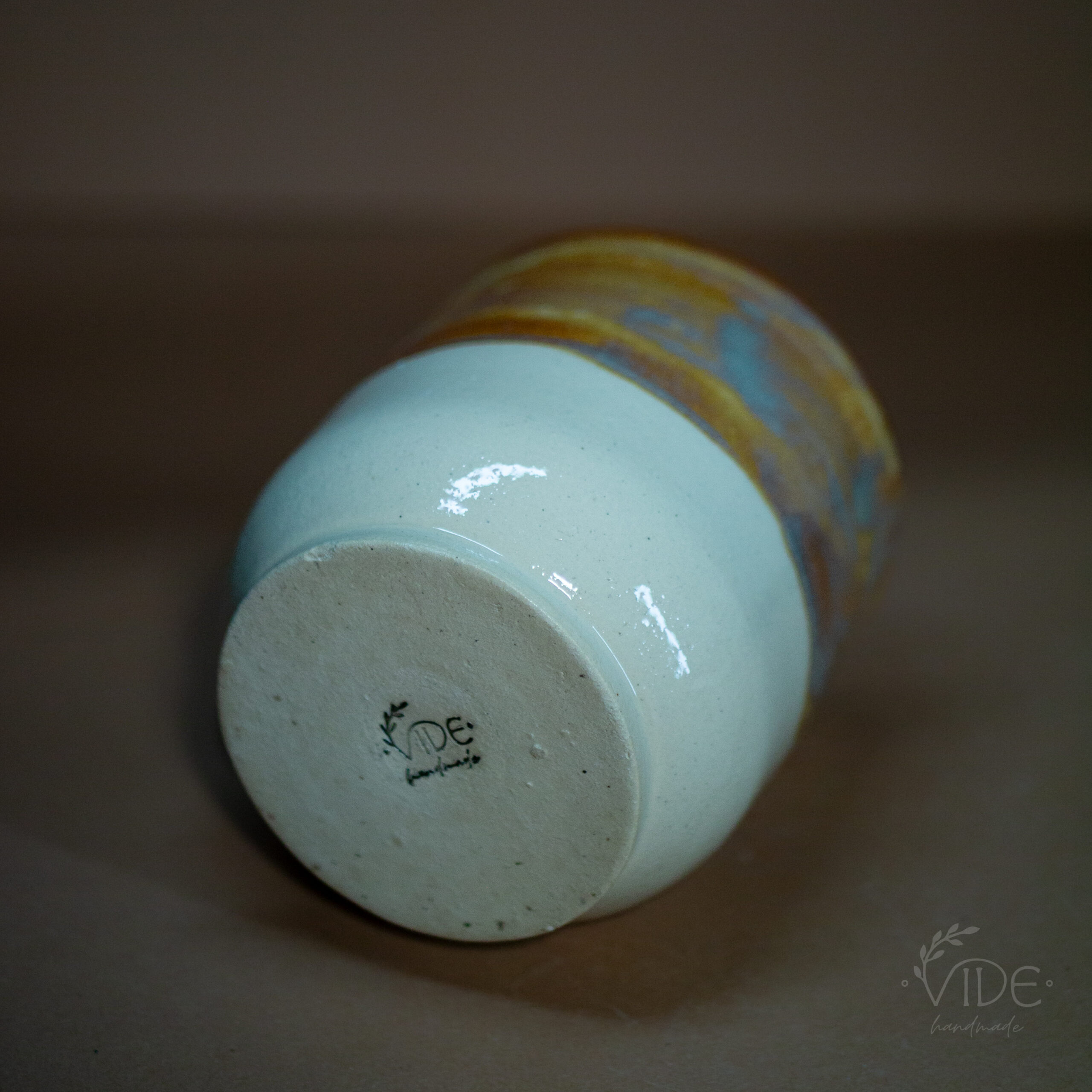 Kubek toczony na kole z jasnej, beżowej gliny, odbitym napisem i nałożonym szkliwem efektowym. Wypalony na wysoki spiek.