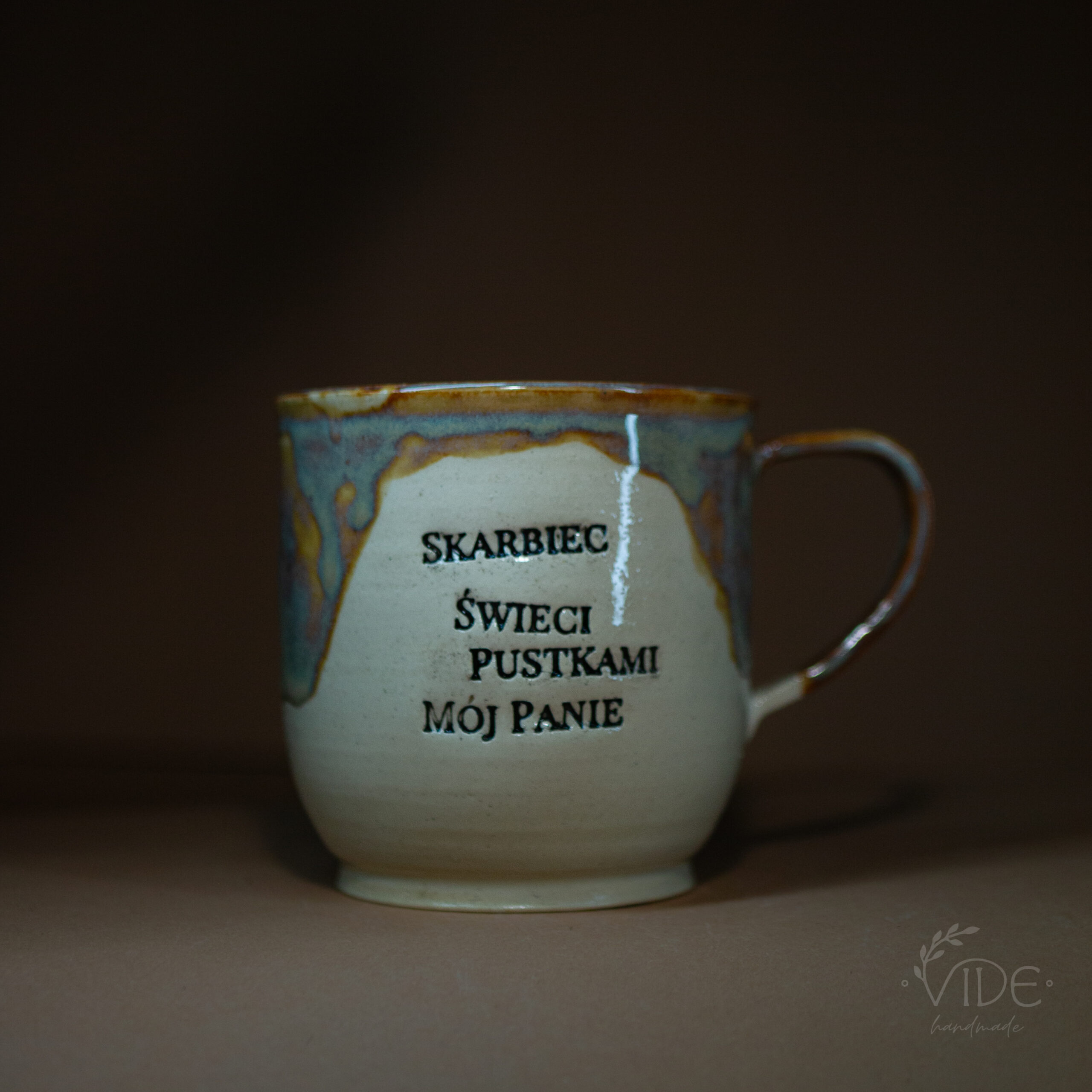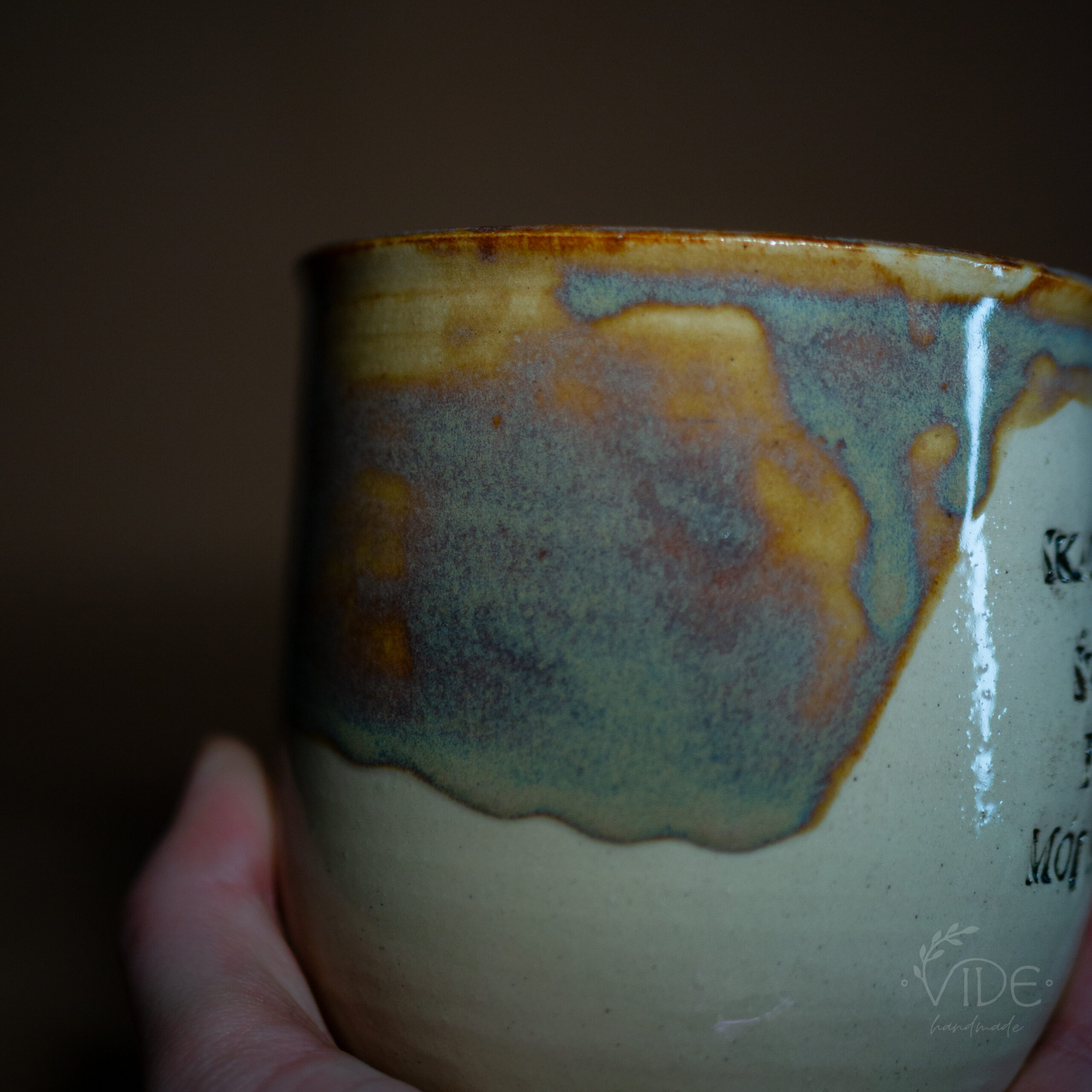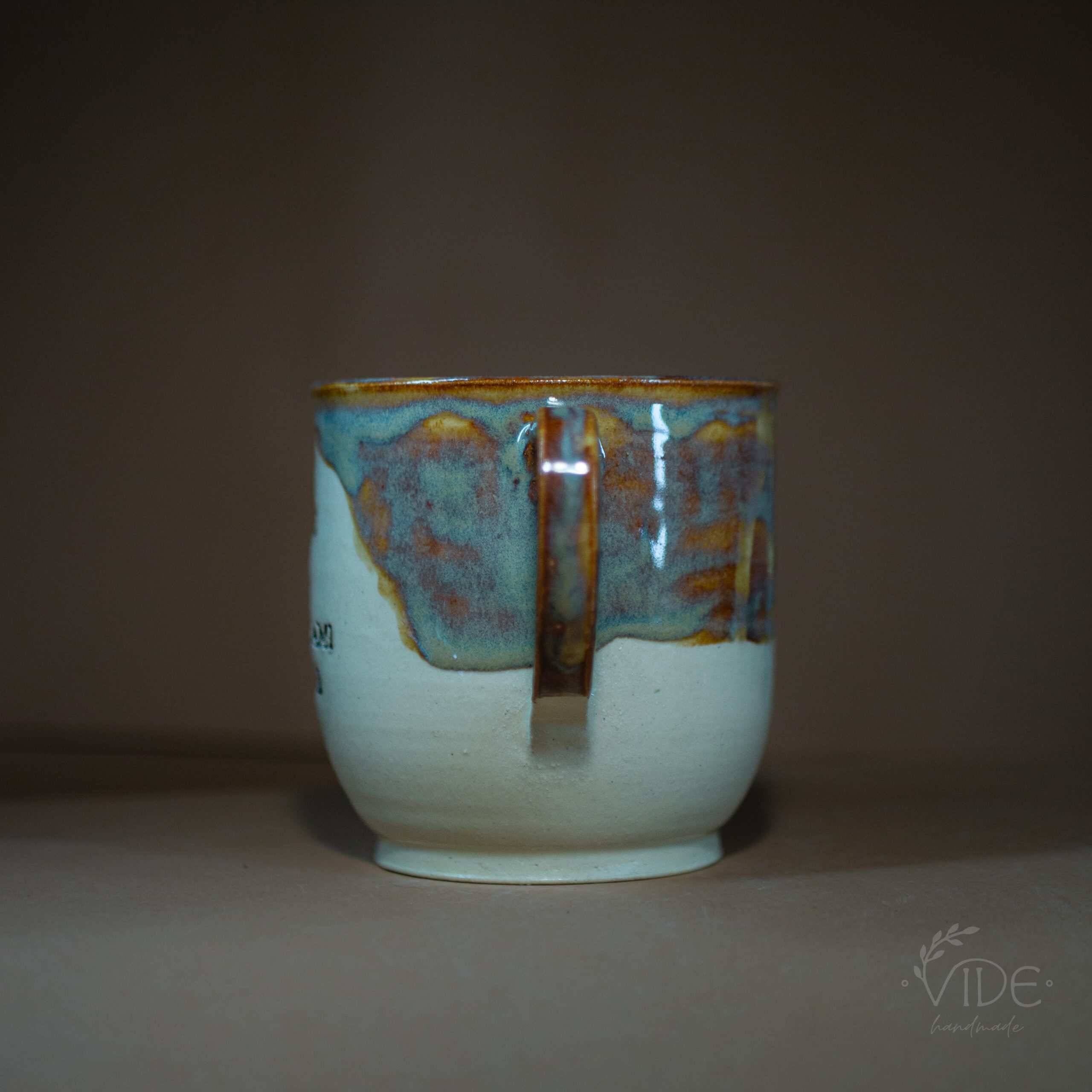 Kubek toczony na kole z jasnej, beżowej gliny, odbitym napisem i nałożonym szkliwem efektowym. Wypalony na wysoki spiek.