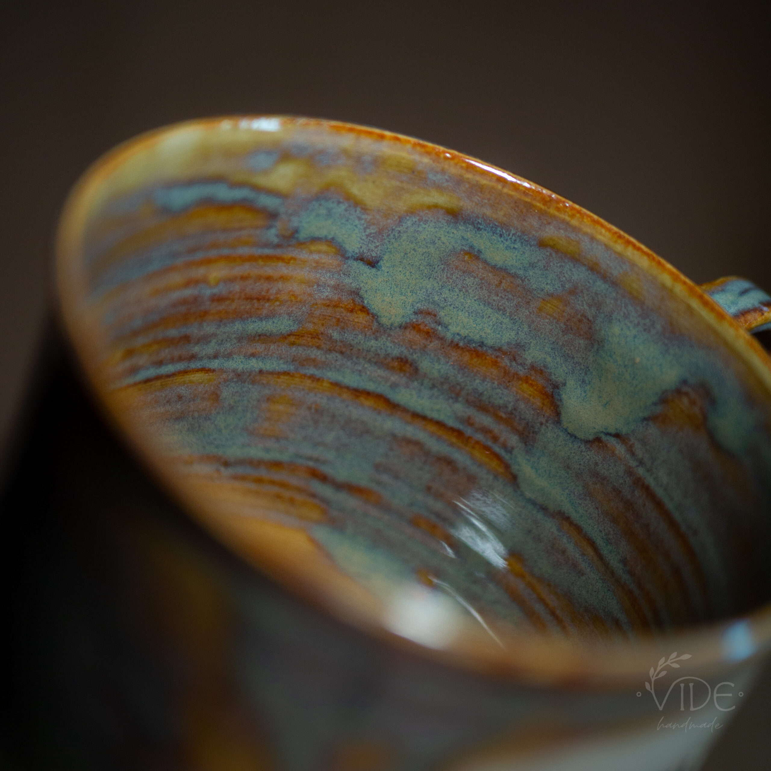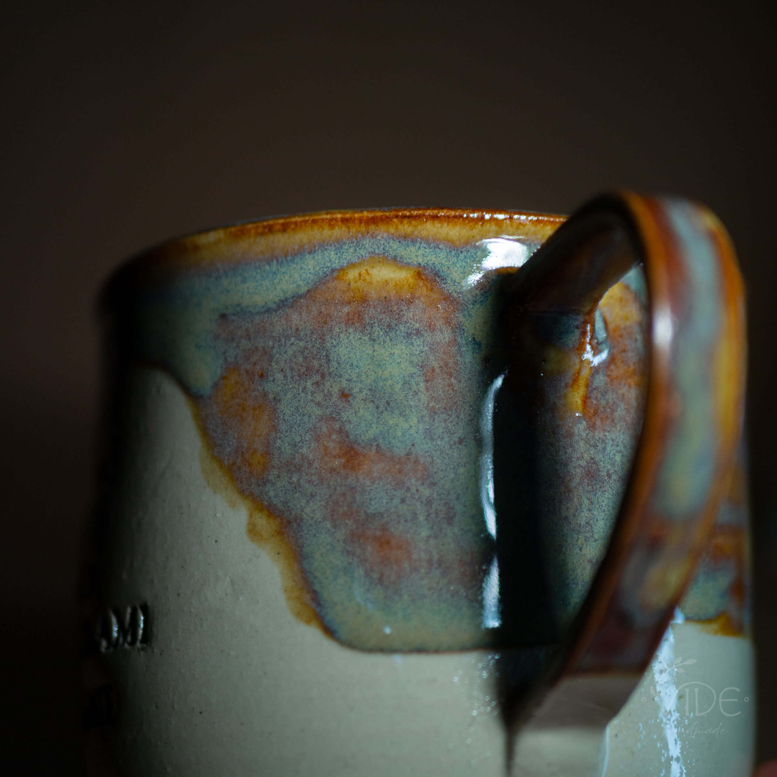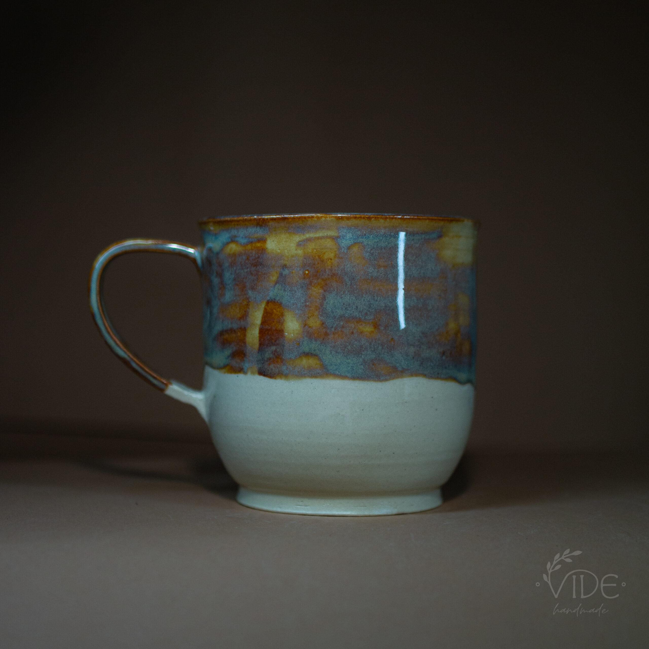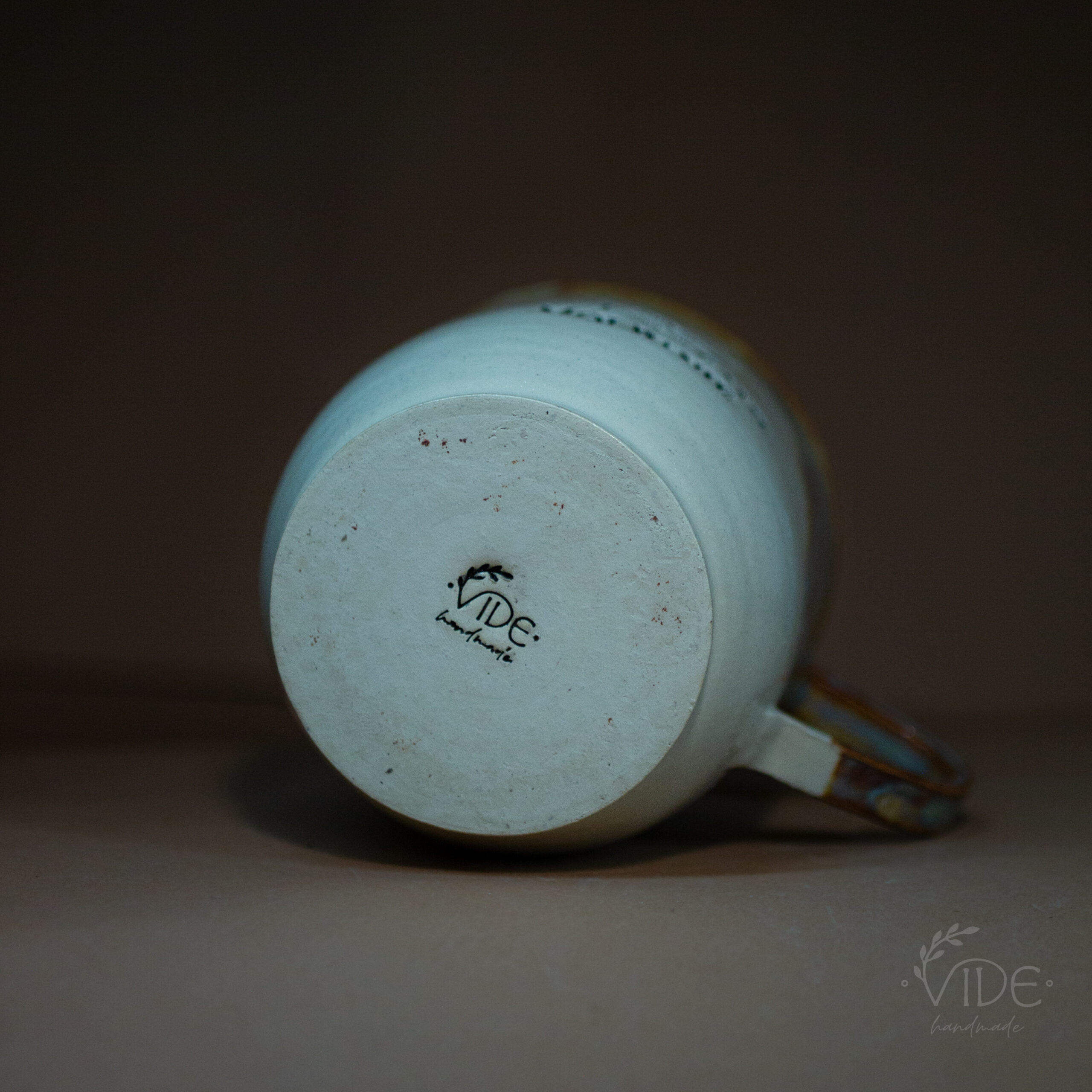 Kubek toczony na kole z jasnej, beżowej gliny, odbitym napisem i nałożonym szkliwem efektowym. Wypalony na wysoki spiek.