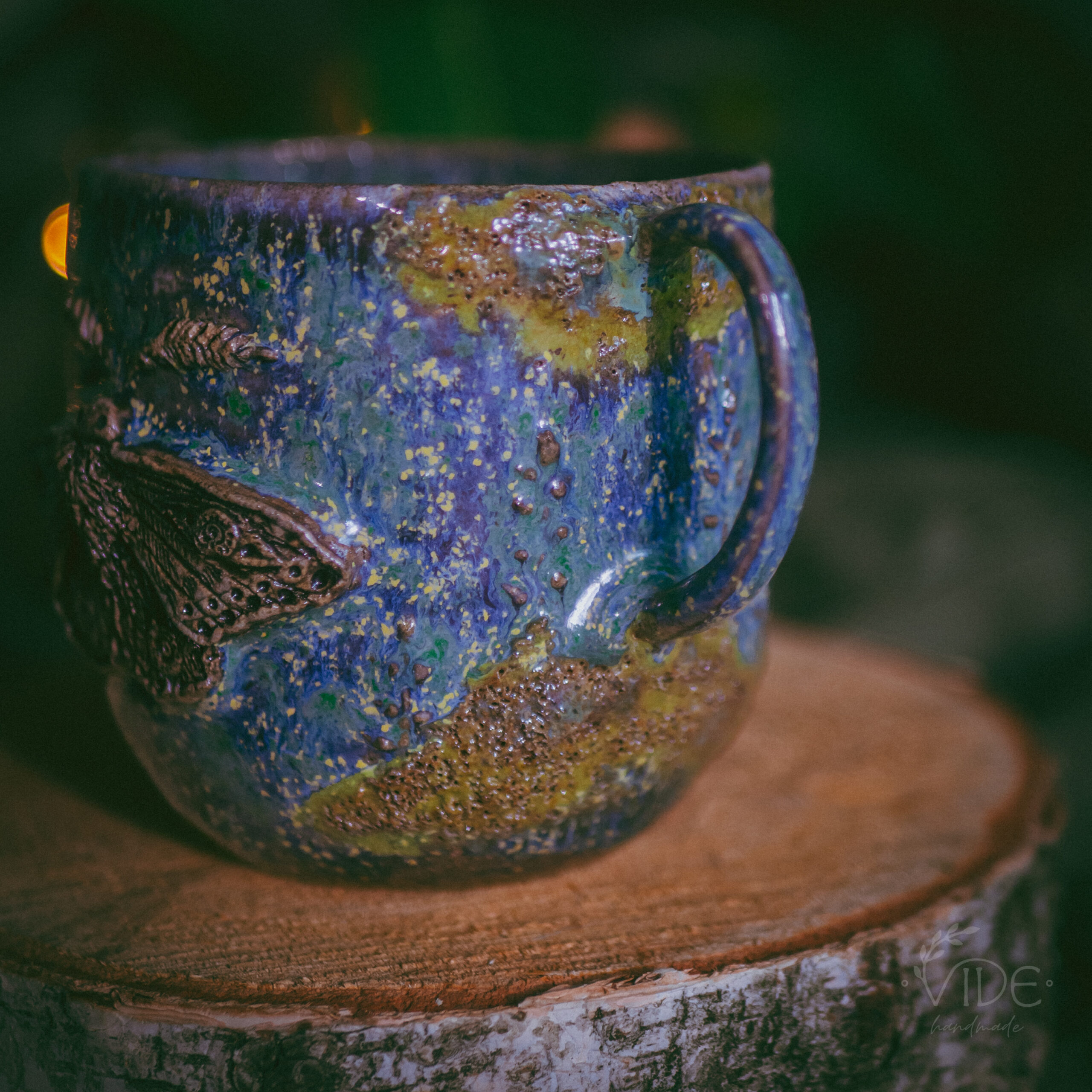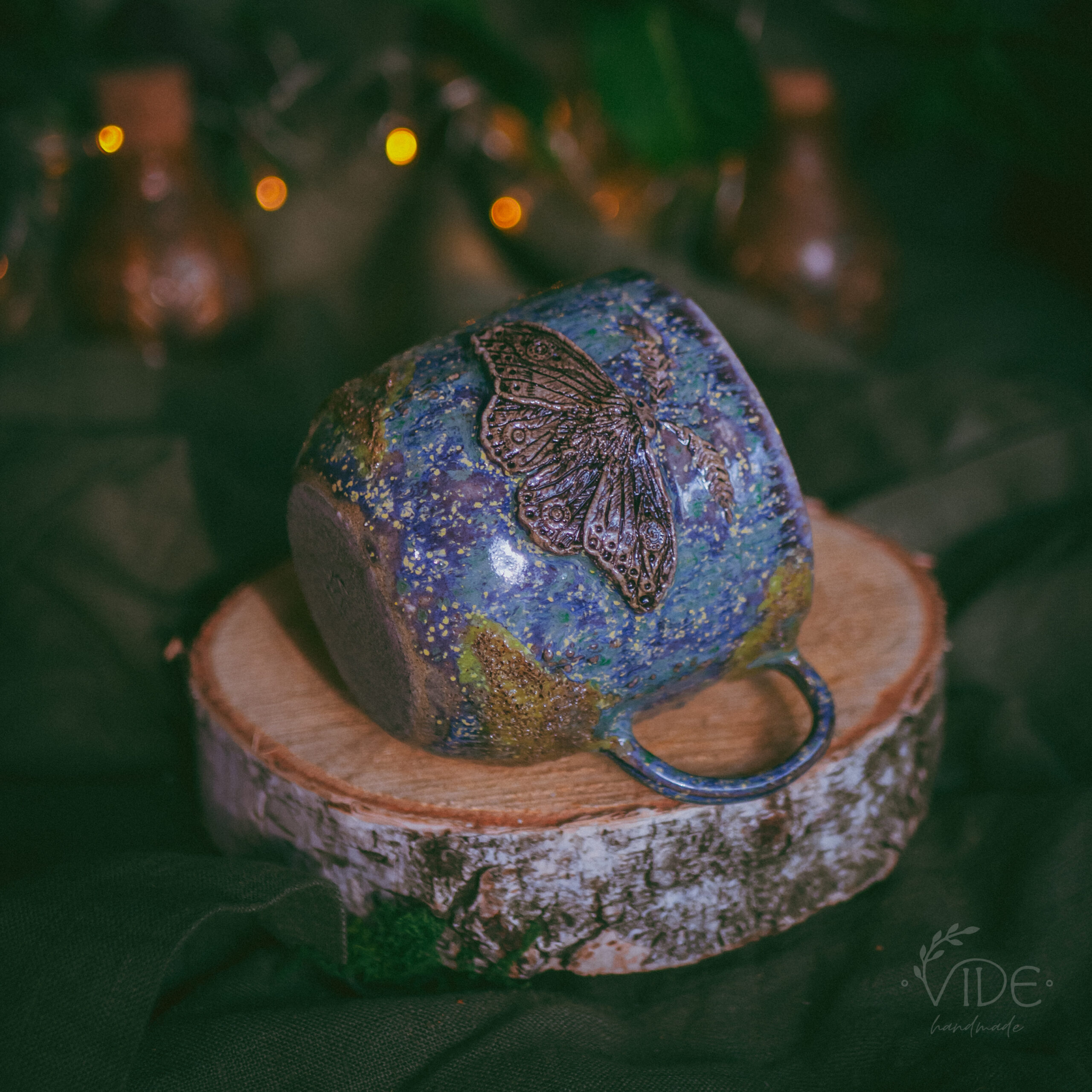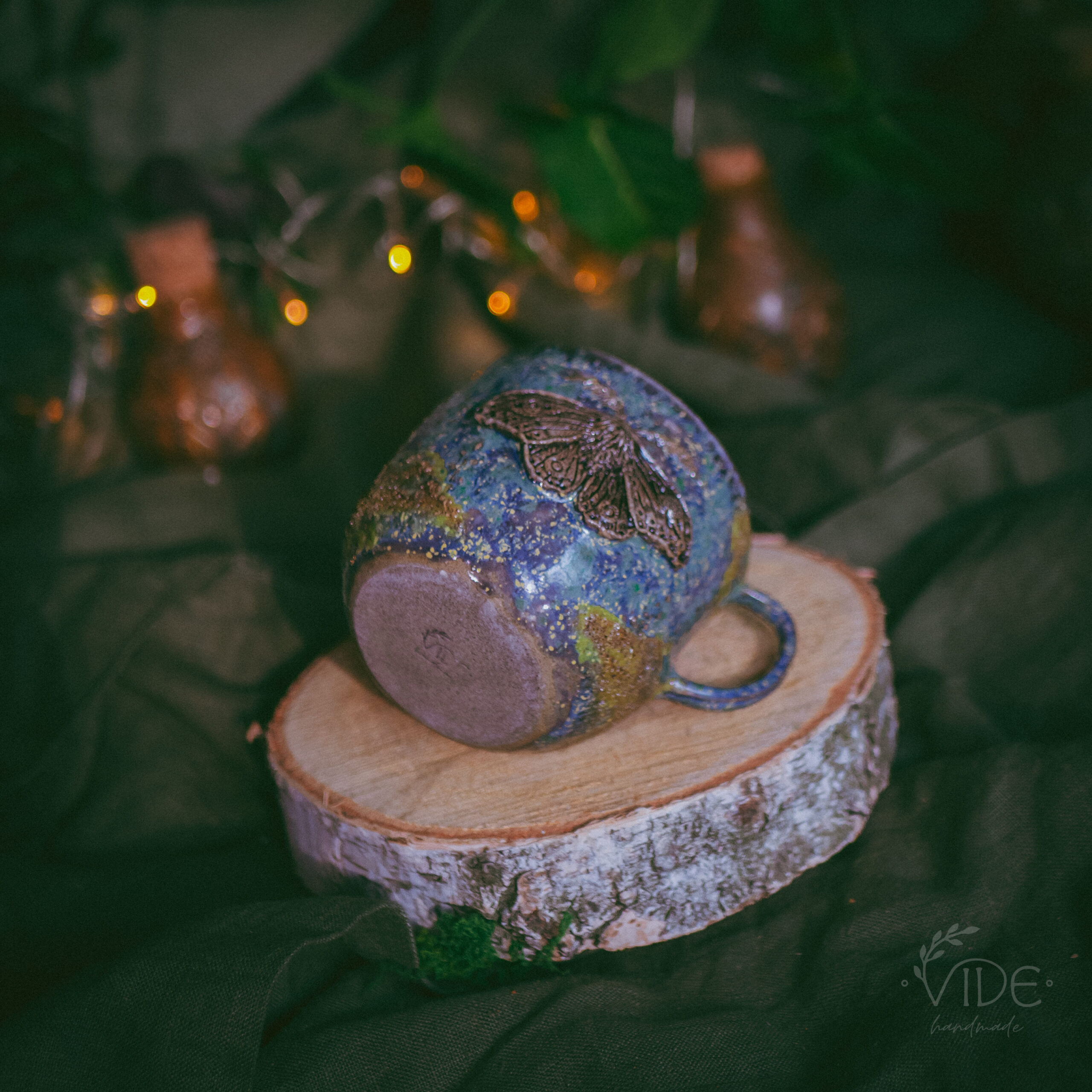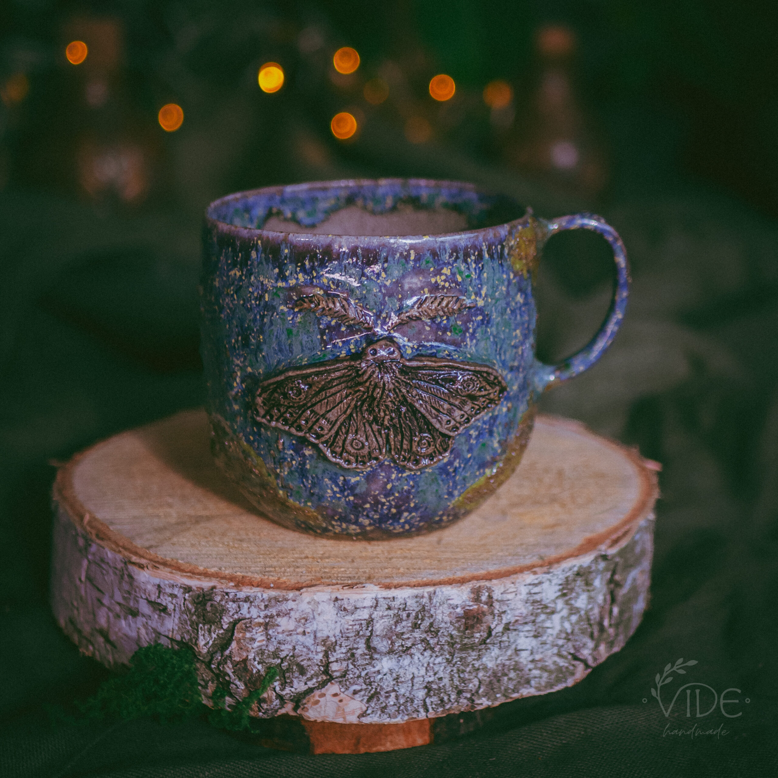 Kubek wykonany z szarej gliny z ozdobnym szkliwieniem na zewnątrz. Poza rzeźbioną ćmą, na kubku można też dostrzec wypukłe motywy roślinne oraz mech – wszystko zostało wykonane ręcznie.