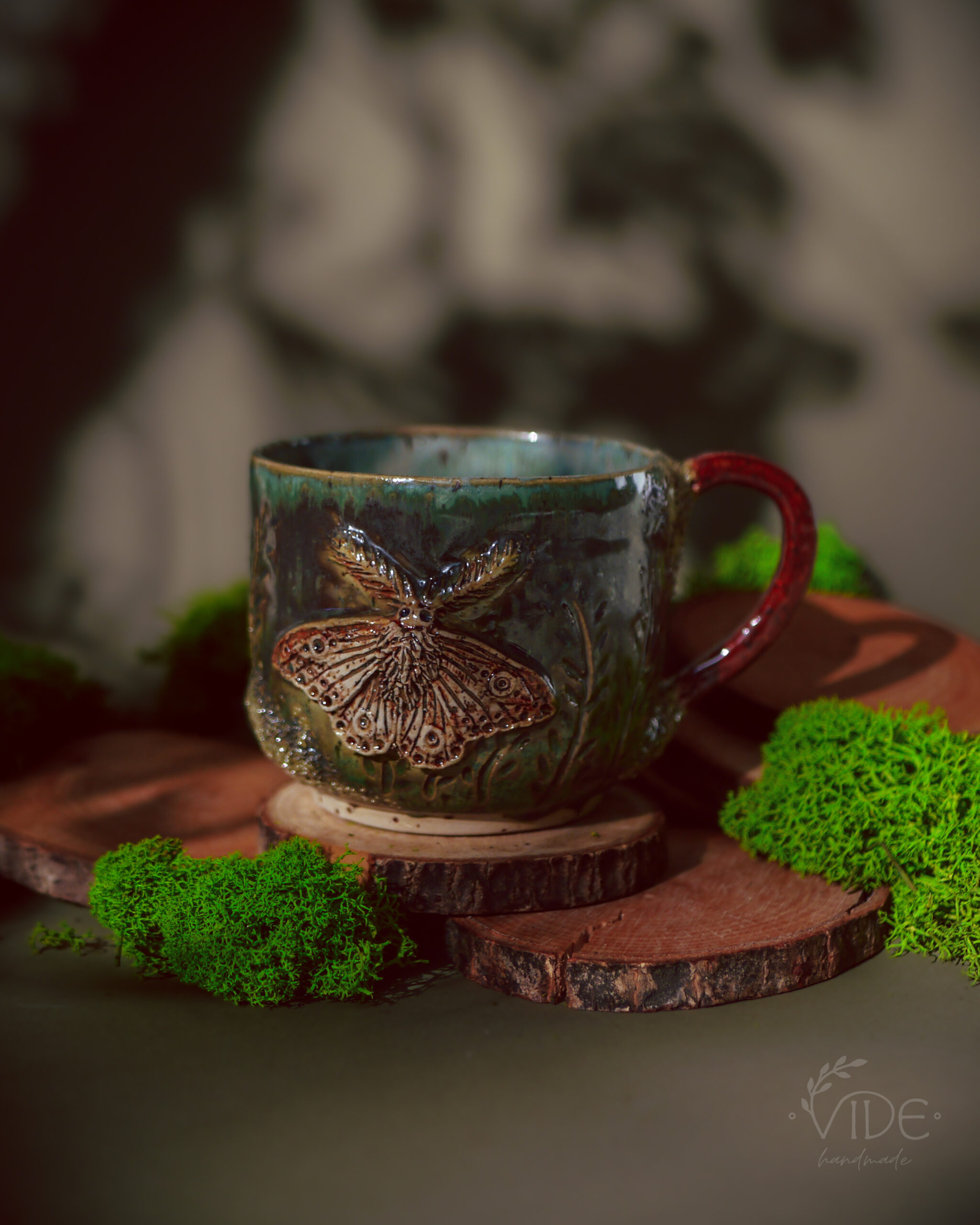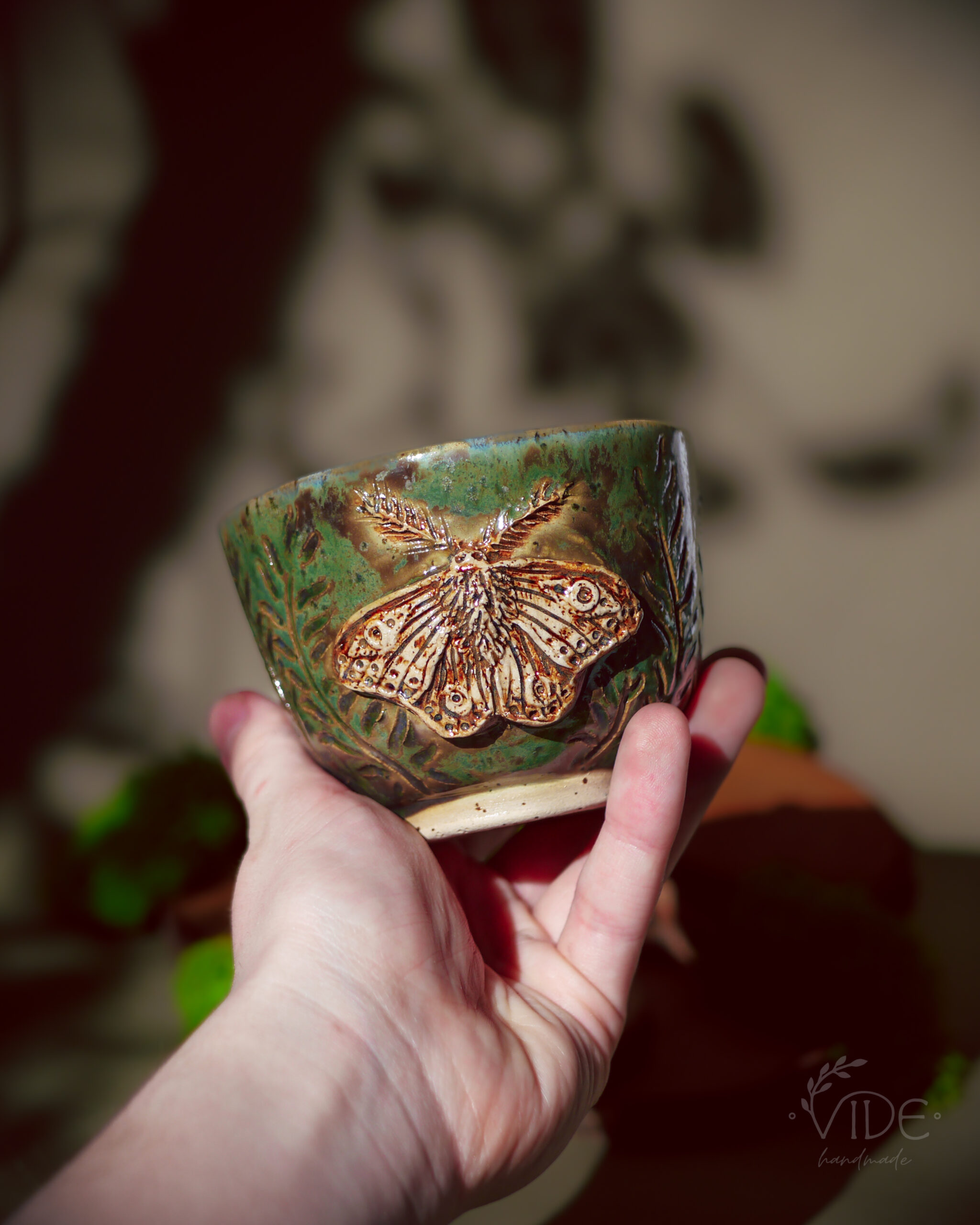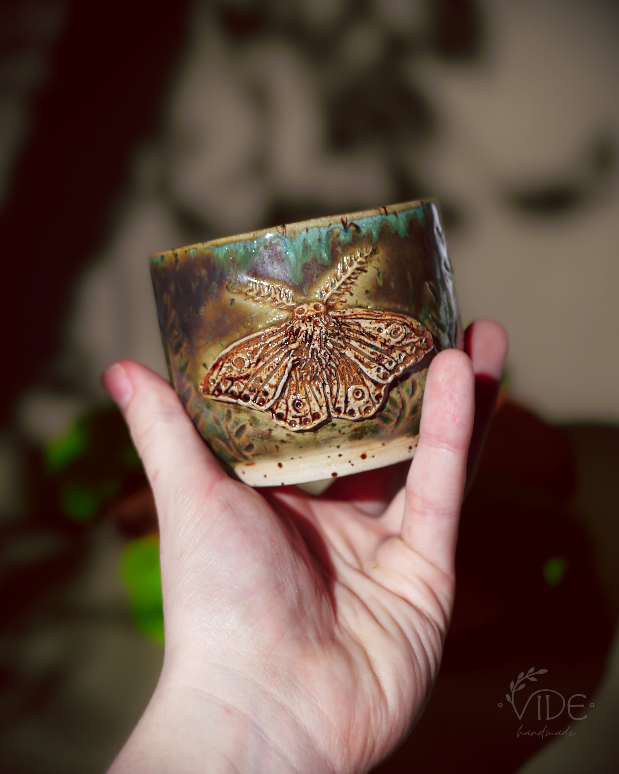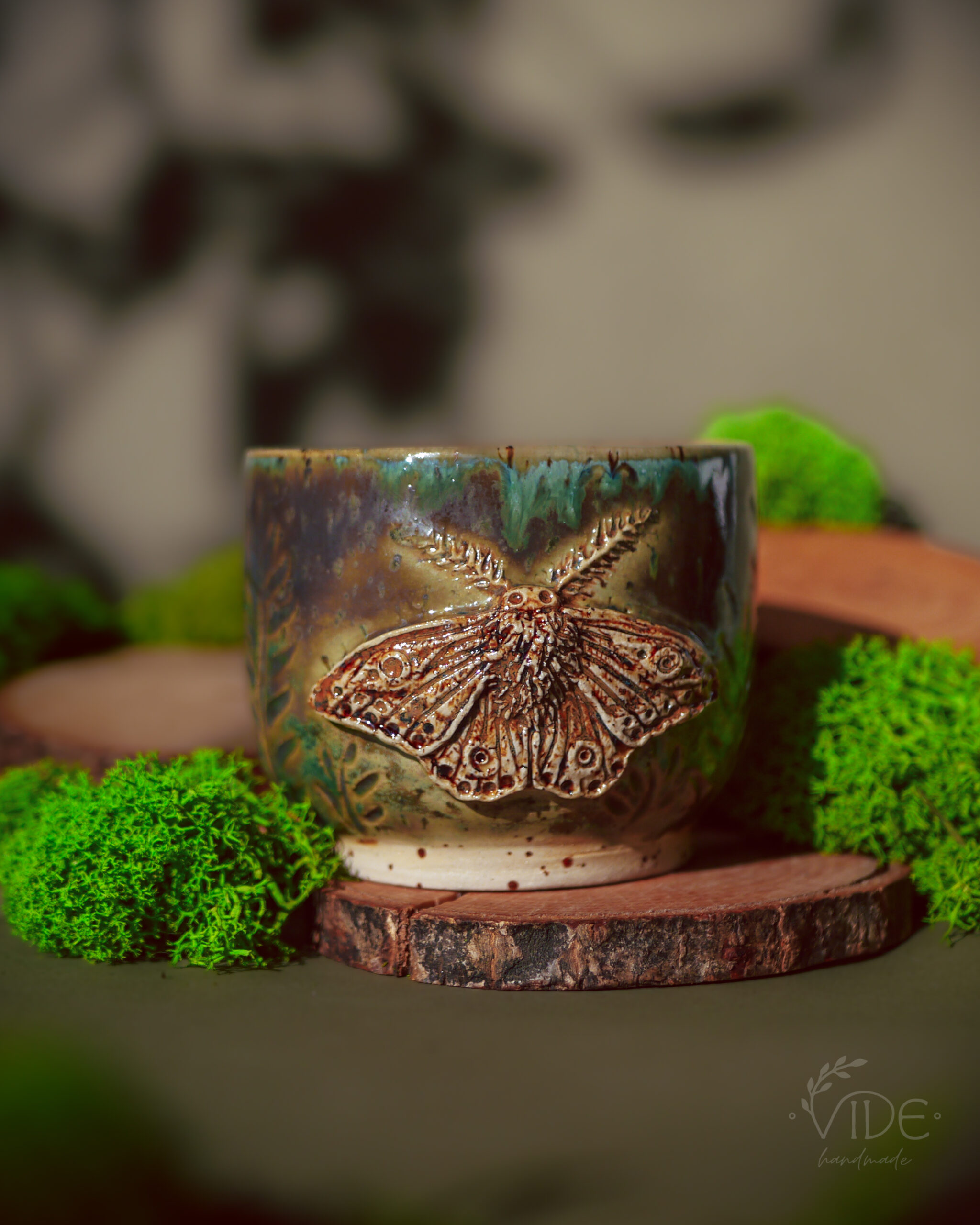 Wykonane ręcznie z dbałością o najdrobniejsze szczegóły, kubki te zdobią wyrzeźbione ćmy — powtarzające formę znaną z czarki Nature’s relics oraz z kolekcji czajnika i filiżanek do herbaty. Ich skrzydła rozkładają się na tle pełnym misternych żłobień, które przypominają dzikie pnącza i leśne rośliny. Dzięki temu tło żyje — a szkliwa, zbierając się w załamaniach gliny, tworzą zjawiskowe efekty przejść kolorystycznych, podkreślając naturalną fakturę i głębię wzoru.