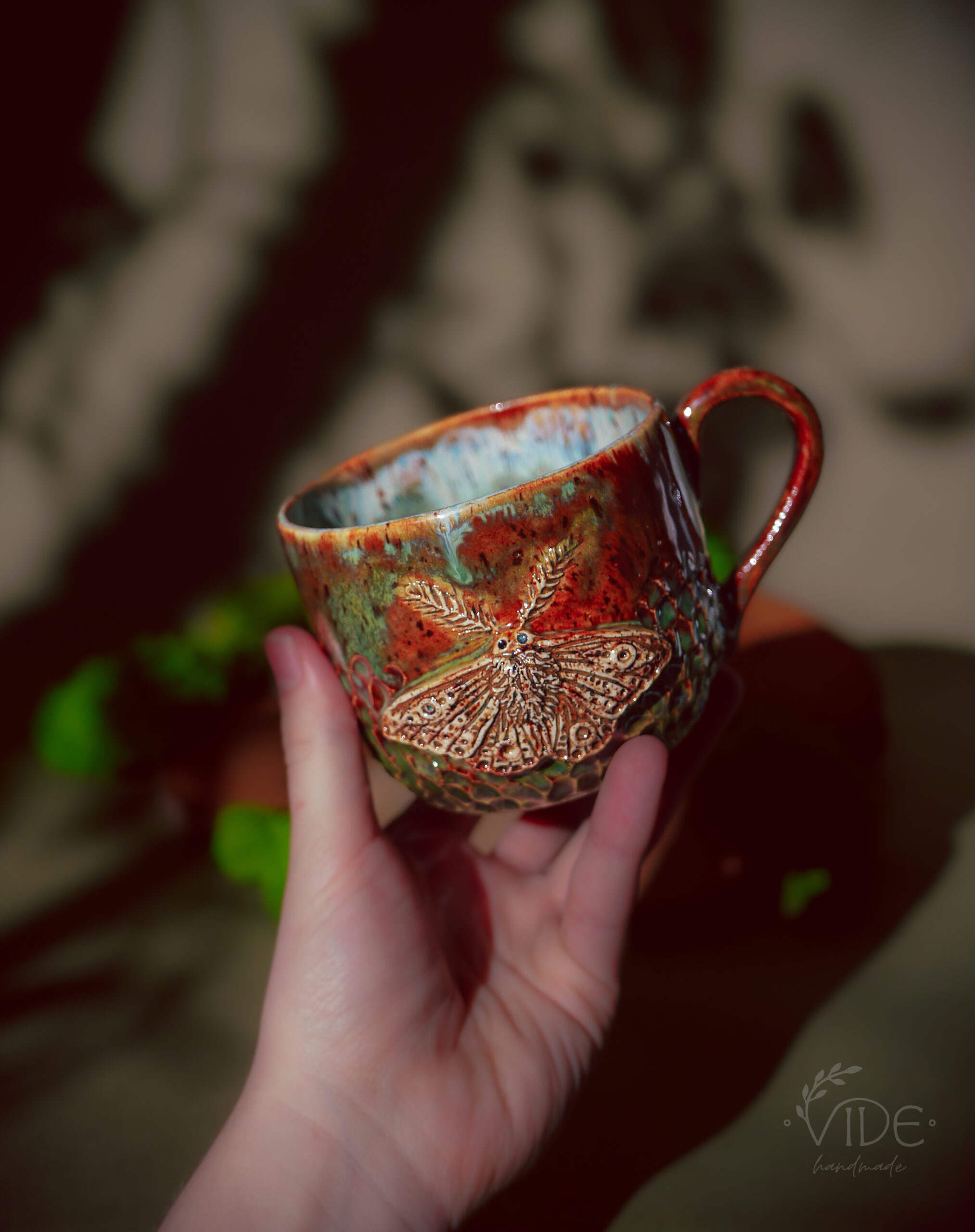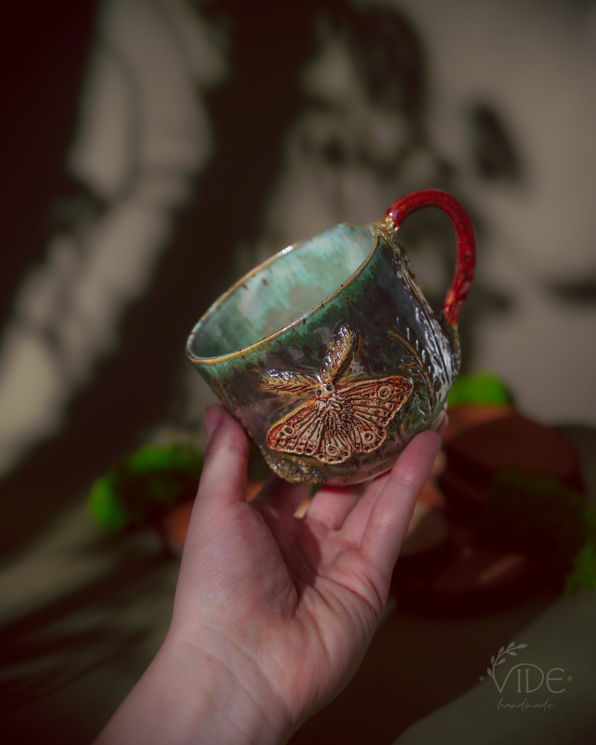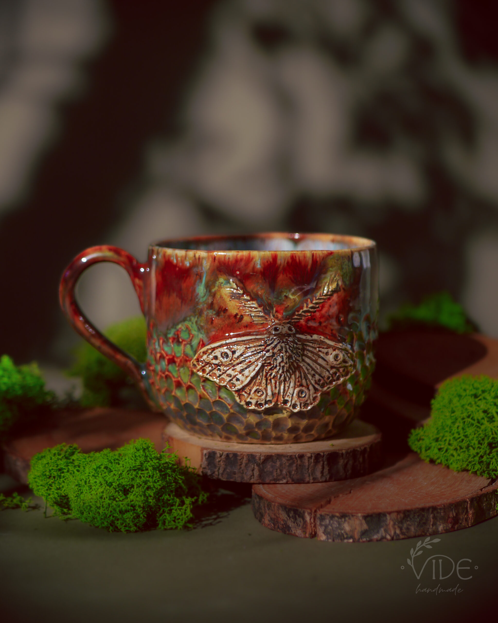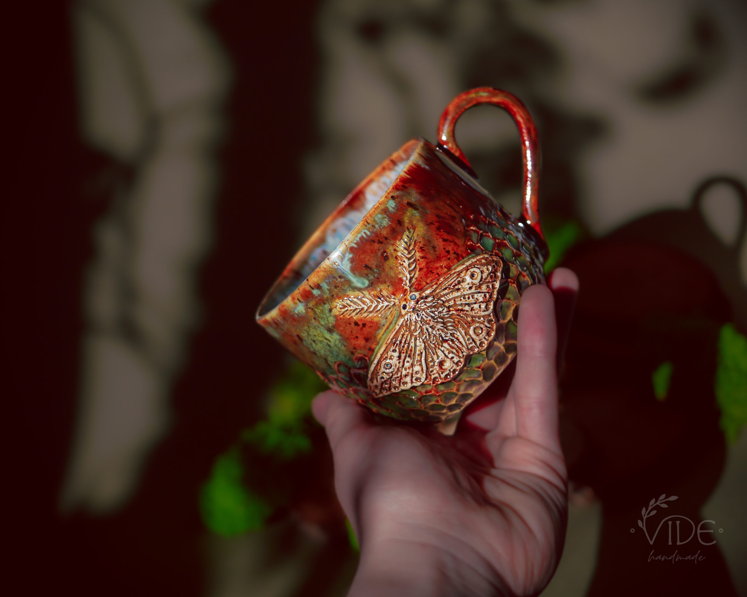 Wykonane ręcznie z dbałością o najdrobniejsze szczegóły, kubki te zdobią wyrzeźbione ćmy — powtarzające formę znaną z czarki Nature’s relics oraz z kolekcji czajnika i filiżanek do herbaty. Ich skrzydła rozkładają się na tle pełnym misternych żłobień, które przypominają dzikie pnącza i leśne rośliny. Dzięki temu tło żyje — a szkliwa, zbierając się w załamaniach gliny, tworzą zjawiskowe efekty przejść kolorystycznych, podkreślając naturalną fakturę i głębię wzoru.