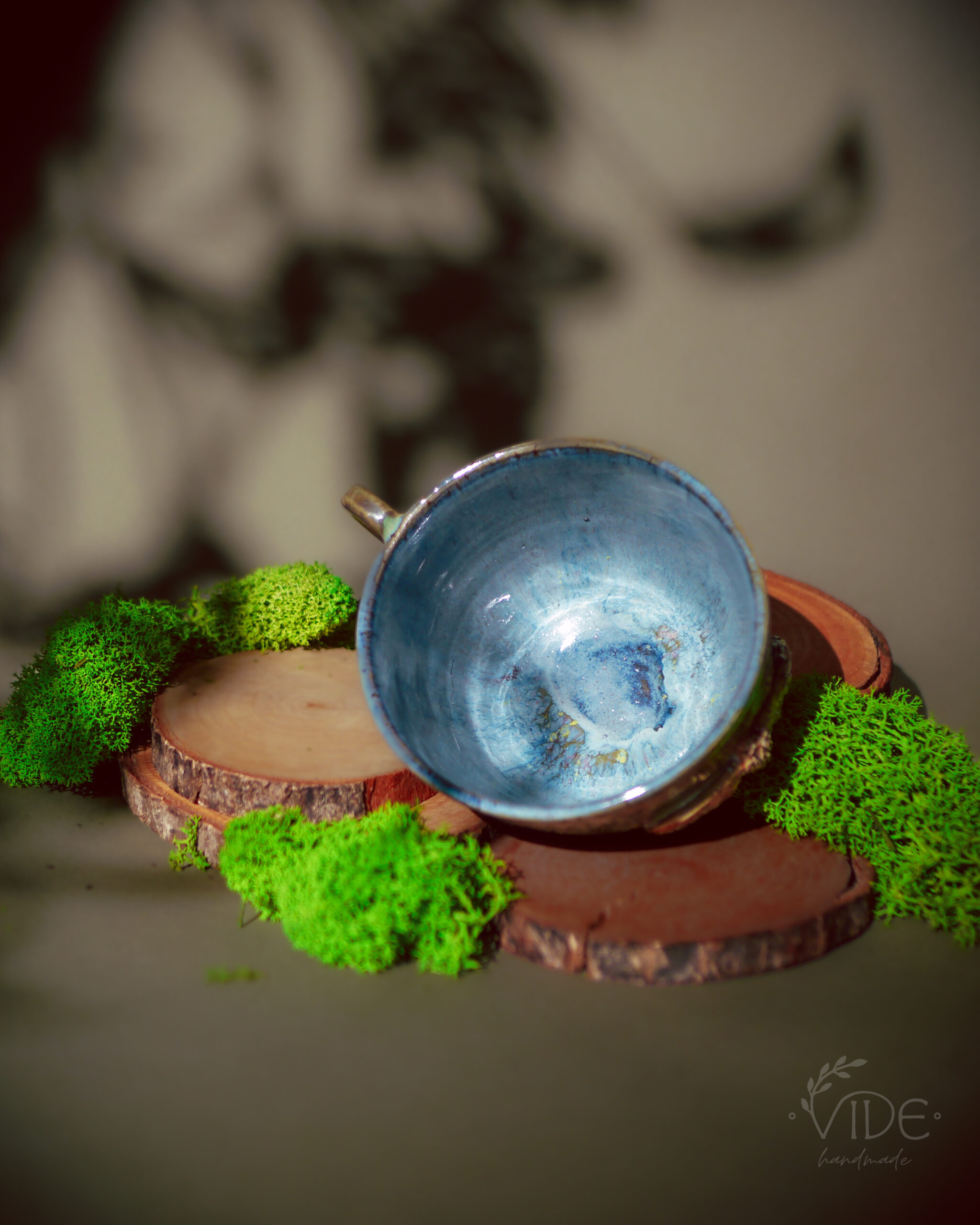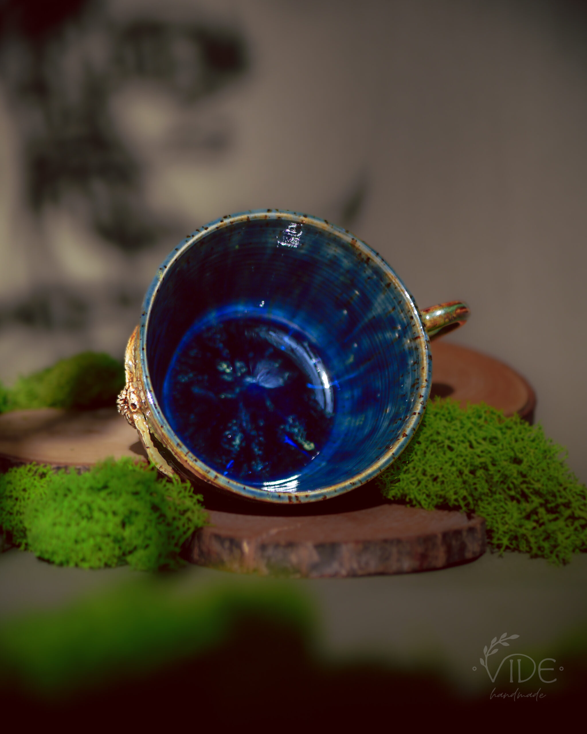 Każdy kubek jest unikatowy: część z nich nosi intensywne, niebieskie tło jak głębokie, nocne niebo, inne toną w stonowanych, ziemistych barwach — od jasnych piasków po szarości mokrej ziemi. Kolory zmieniają się w zależności od światła, wydobywając ukryte niuanse i nadając każdemu egzemplarzowi własny charakter.