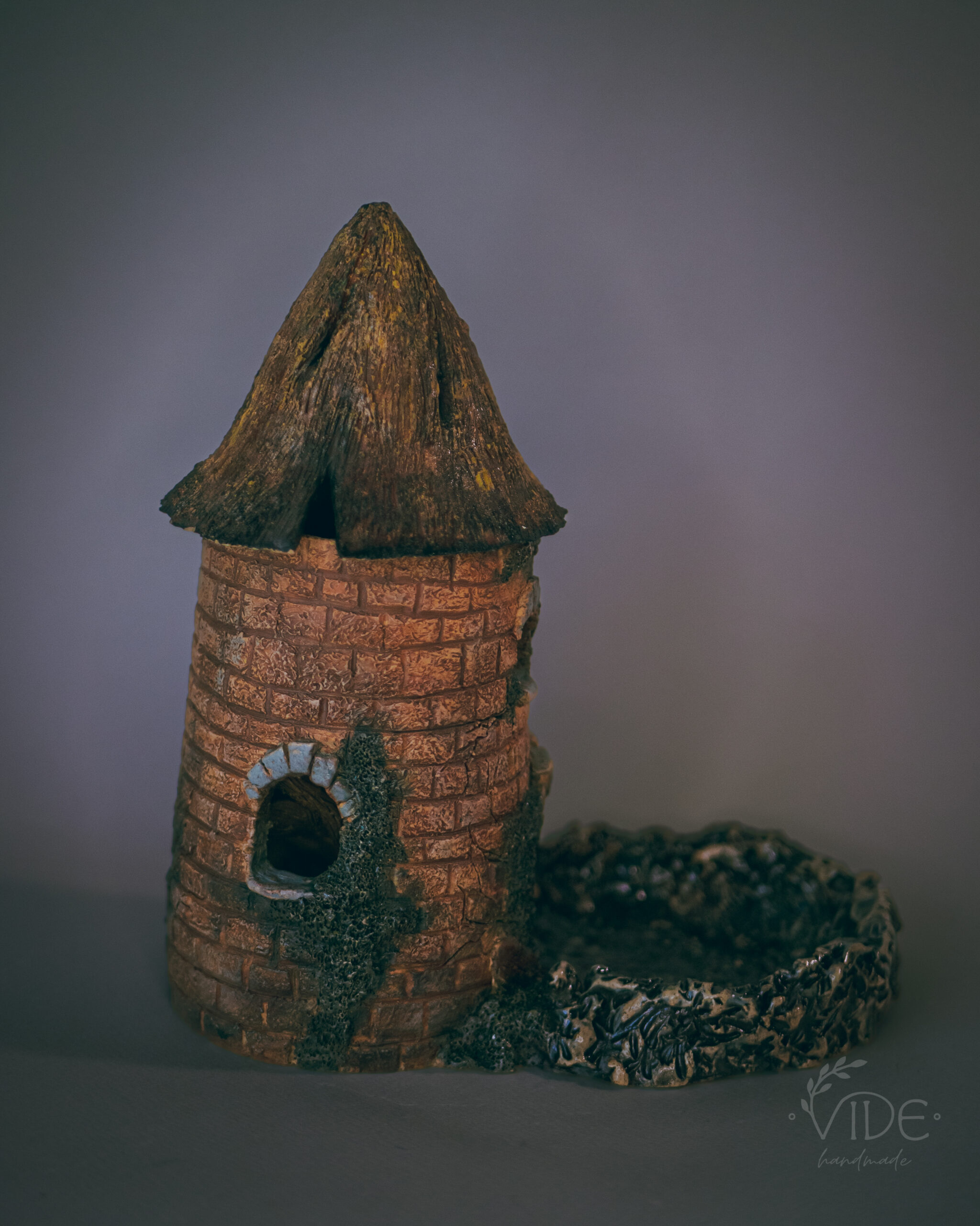 Ta ręcznie wykonana wieża to wyjątkowy przedmiot o potrójnym przeznaczeniu: służy zarówno jako wieża do kości, wieża na kadzidło oraz lampion. Dzięki oknom i misternym pęknięciom w strukturze cegieł światło lampek lub dym kadzidła wydobywa się na zewnątrz, tworząc wokół niej magiczną aurę.